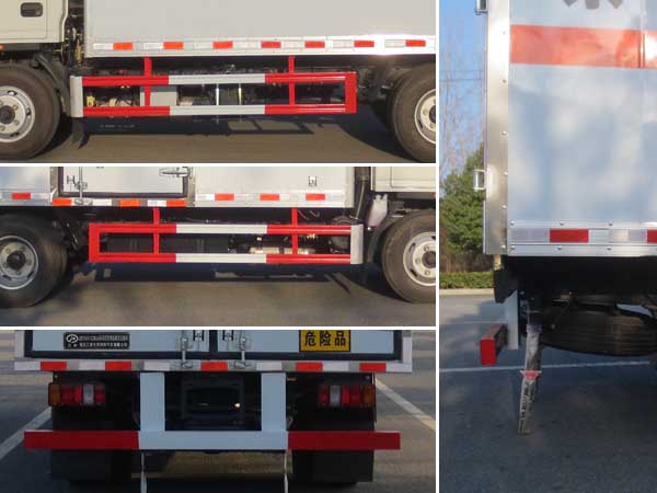 | 廂體頂部封閉,不可開啟;廂體選裝瓦楞板結構,廂體側面選裝開門型式及位置或不帶側開門,選裝百葉窗;運輸介質類項號為:9;該車為危險品貨物運輸車;僅采用前輪盤式制動器,前置排氣管,子午線輪胎,限速裝置的底盤,限速80km/h;轉向輪安裝爆胎應急防護裝置;發(fā)動機與油耗申報值(L/100km)對應關系為:JX4D30B6H/11.1,JX4D30A6H/11.4,JX4D30C6H/11.4;該車安裝具有衛(wèi)星定位功能的行駛記錄儀;液剎ABS系統(tǒng)型號:APG3550500A,ABS系統(tǒng)生產(chǎn)廠家:浙江亞太機電股份有限公司;氣剎ABS系統(tǒng)型號: VIE ABS-II,ABS系統(tǒng)生產(chǎn)廠家: 浙江萬安科技股份有限公司;側面防護及后下部防護裝置材料材質:Q235,連接方式:焊接加螺栓連接;后下部防護裝置斷面尺寸(寬×高):50×100(mm),離地高度:460mm. | |||