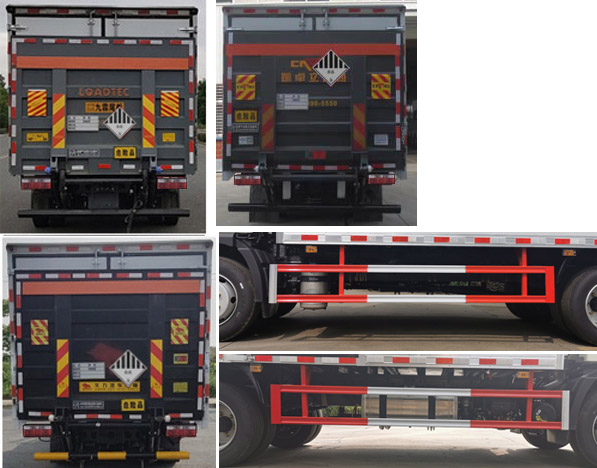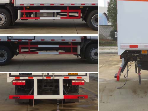 | 廂體頂部封閉,不可開啟;隨底盤選裝駕駛室;選裝底盤附件及油箱左右安裝位置;僅采用底盤3900mm軸距;廂體選裝瓦楞板結(jié)構(gòu),廂體側(cè)面選裝開門型式及位置或不帶側(cè)開門,選裝百葉窗;選裝起重尾板(收起狀態(tài)水平長度為290mm),尾板質(zhì)量為450kg;選裝不同廠家尾板以及尾板外觀;運輸具有**容器(瓶)包裝的介質(zhì)類項號為:9;該車為危險品貨物運輸車;僅采用前輪盤式制動器,前置排氣管,子午線輪胎,限速裝置的底盤,限速80km/h;轉(zhuǎn)向輪安裝爆胎應(yīng)急防護裝置;發(fā)動機/油耗申報值(L/100km)對應(yīng)關(guān)系為:WP3NQ160E61/20.8,CA4DD1-16E6/20.8;該車安裝具有衛(wèi)星定位功能的行駛記錄儀;ABS生產(chǎn)廠家/型號:1.廣州瑞立科密汽車電子股份有限公司/CM4XL-4S/4M;2.浙江萬安科技股份有限公司/VIE ABS-II;側(cè)面防護及后下部防護裝置材料材質(zhì):Q235,連接方式:焊接加螺栓連接;后下部防護裝置斷面尺寸(寬×高):50×100(mm),離地高度:480mm;選裝起重尾板時,后防護為圓形結(jié)構(gòu),后下部防護裝置材料材質(zhì):Q235,連接方式:焊接加螺栓連接;后下部防護裝置斷面尺寸(直徑):Φ120(mm),離地高度:420mm.該車選裝ETC車載裝置. | |||